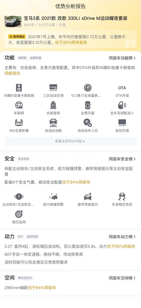 今天介绍的这款二手宝马3系330是2021款改款330Li xDrive M运动曜夜套装,首次上牌时间为2021年7月,车源地和上牌地均为东莞,过户次数为1次。表显里程3.1万公里,符合国VI排放标准。车身颜色为黑色,内饰颜色为深色。新车指导价为40.59万,目前二手车报价22.98万。